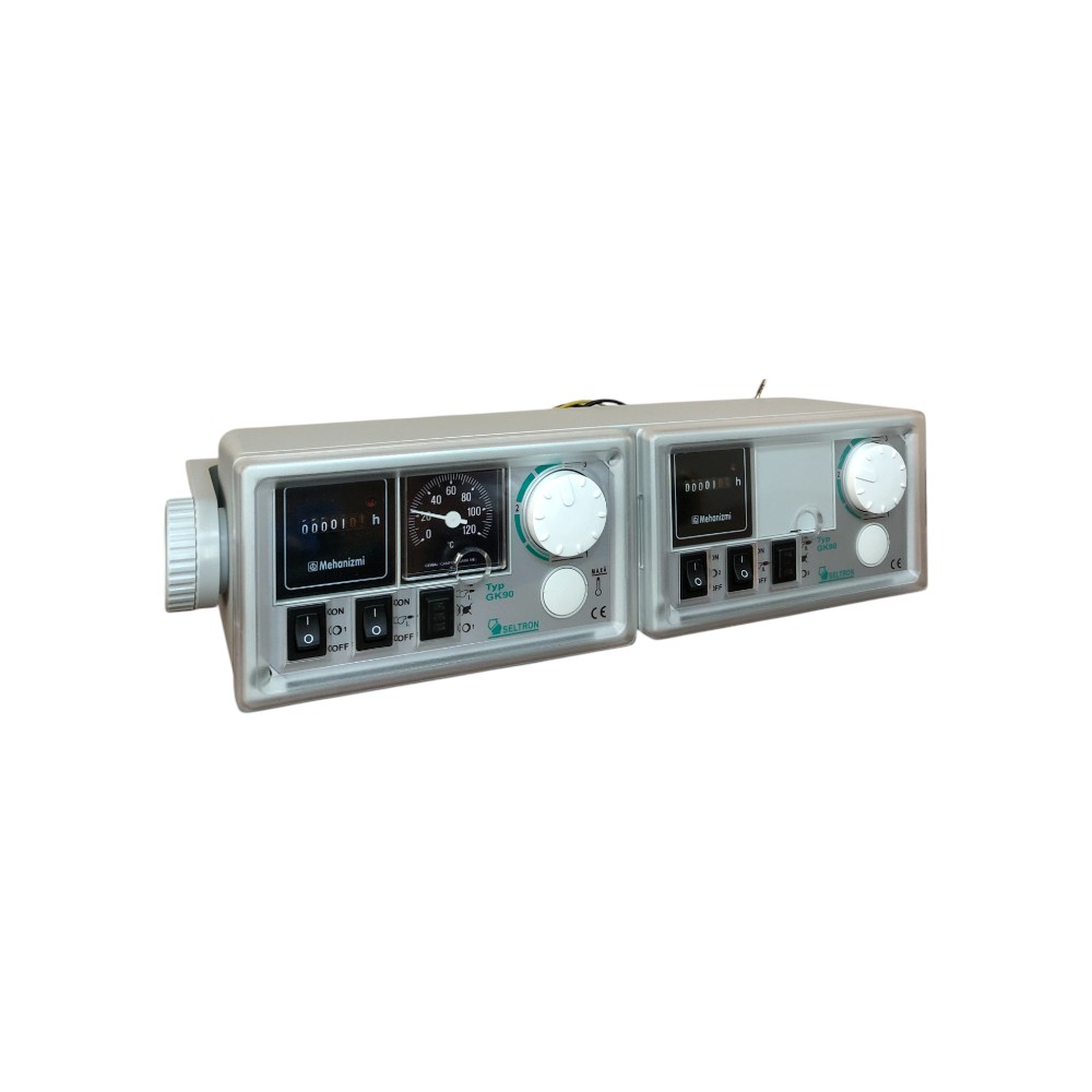 Kotlovski regulator GK90 namenjen je održavanju radne temperature kod kotlova na tekuće gorivo. Regulator se sastoji od modula za 1. i modula za 2. stepen gorionika. GK90 se koristi za radnu temperaturu kotla do 90°C. Moduli imaju ugrađene i brojače radnih sati gorionika za 1. i 2. stepen odvojeno. Radna temperatura za 1. stepen gorionika podešava se termostatom (9a), a za 2. stepen termostatom (9b). Temperatura drugog stepena postavlja se nešto niže od temperature za 1. stepen gorionika. U modul za 1. stepen ugrađen je sigurnosni termostat (10), koji isključuje gorionik u slučaju prekoračenja maksimalne dozvoljene temperature u kotlu. 1. stepen gorionika uključuje se prekidačem (4a), a 2. stepen prekidačem (4b), što signalizira lampica (7a i 7b). Grešku u radu gorionika signalizira crvena lampica (5a i 5b). Prekidačem (2a) uključuje se vodeća cirk. pumpa (KT1), a prekidačem (2b) cirk. pumpa sa domešavanje (KT2). Kapilarni termostat (8a) meri temperaturu u kotlu.